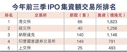 港交所今年首三季以1,823億元(港元,下同)的IPO集資額,大幅領先其他交易所,穩居全球IPO交易所龍頭寶座。會計師樓德勤昨指出,港交所目前正處理逾230宗上市申請,當中有至少5隻包括A+H項目在內且集資額各逾10億美元的超大型新股,料第四季本港新股市場維持強勁,全年將有逾80隻新股上市,集資2,500億至2,800億元,集資額較該行今年6月中預測的2,000億元上調25%至40%。