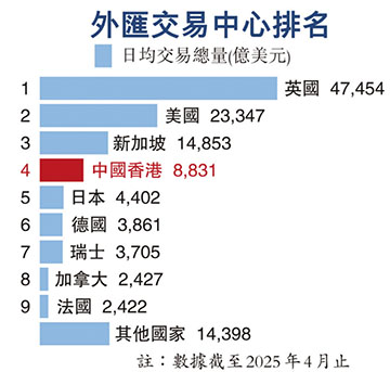 自全球各地加緊「去美元化」動作,人民幣的國際地位持續上升。國際結算銀行(BIS) 9月30日公布的調查報告顯示,人民幣的全球交易量已飆升至折合每日8,174億美元,佔全球匯市交易約8.5%,高於2022年的7%。而作為全球交易量排第5的貨幣,人民幣與位居第4的英鎊正拉近距離,而英鎊的佔比從2022年的12.9%降至10.2%。此外,香港繼續是全球第4大的外匯交易中心,以及全球最大的離岸人民幣業務樞紐。 ●香港文匯報記者 周紹基BIS公布中央銀行外匯與場外衍生工具市場成交額調查結果,該調查每三年發布一次,今次的調查結果顯示,人民幣的全球交易量已飆升至每日8,174億美元,延續了長達10年的增長趨勢,並對英鎊步步緊迫。報告顯示,截至今年4月止,英鎊的日均交易量為9,813億美元,而人民幣的交易規模與英鎊已相當接近,且兩者差距不斷收窄。分析員:人民幣交易量直逼英鎊有外資銀行分析員表示,中國多年來,一直致力提升人民幣對全球的吸引力,為此,內地更放鬆了部分資本管制,旨在削弱美元的主導地位。新加坡銀行外匯策略師Moh Siong Sim亦表示,隨着人民幣國際化進程取得進展,人民幣交易量正迅速逼近英鎊。不過,現時內地的跨境資本流動限制等措施仍在,使得美元的全球主導地位仍未能撼動。在全球「去美元化」風潮下,瑞士法郎的交易量亦見大幅上漲。BIS的調查發現,瑞郎的日均交易量升至6,116億美元,超過澳洲元及加元,成為第6大交易貨幣。港元的份額也顯著上升,從2.6%升至3.8%。香港人民幣日均成交金額增六成人民幣愈來愈受全球歡迎,香港也從中受惠。香港金管局指出,人民幣的國際化使香港繼續成為全球第4大外匯交易中心,以及全球最大的離岸人民幣業務樞紐。香港外匯交易的平均每日成交金額由2022年4月的6,944億美元,增長27.2%至2025年4月的8,831億美元。增長主要由外匯掉期(增33.0%或1,398億美元)、即期交易(增28.7%或385億美元)及場外期權交易(增165.4%或314億美元)的增加所帶動。外匯掉期合約是交投最活躍的工具,佔平均每日成交金額的64%(5,637億美元)。香港同時維持全球最大離岸人民幣外匯及場外利率衍生工具中心的地位。人民幣外匯交易平均每日成交金額由2022年4月的1,912億美元,增長64.8%至2025年4月的3,151億美元。人民幣場外利率衍生工具的平均每日成交金額亦由2022年4月的147億美元,增長67.1%至2025年4月的245億美元。場外利率衍生工具方面,香港在2025年4月的平均每日成交金額為841億美元,其中以美元、人民幣及澳洲元場外利率衍生工具在香港市場交易最為活躍。