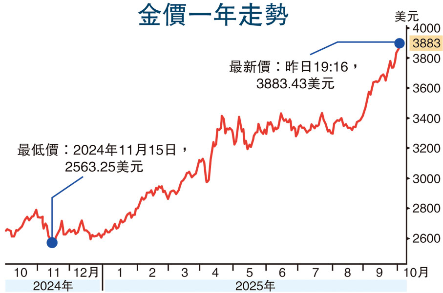 香港文匯報訊(記者 周曉菁)美國聯邦政府停擺刺激金價屢創新高,香港時間周三早間,現貨金價曾升至每盎司近3,900美元,連續第5日上升;紐約期金曾升穿3,900美元,高見3,922.7美元。年初至今金價已飆升近50%,高盛發報告稱,金價還有上漲空間,甚至可能高於其此前的預估。各國央行或加速買進黃金該報告表示,流入黃金支持的交易所交易基金(ETF)的資金超出十分強勁,超過他們此前的模型預期。私人投資者大幅將資金轉移至黃金的可能性,對他們的預測,即明年中達到每盎司4,000美元和明年底每盎司4,300美元,構成巨大的上行風險。該行早一個月前曾表示,如果1%私人持有的美債資金轉投黃金,金價可能升至近5,000美元。道富投資管理黃金策略主管Aakash Doshi表示,隨着投資需求已成為支撐價格在歷史高位的重要因素,金價升至每盎司4,000美元只是時間問題。此外,多間大行近期均上調金價預測,有機構料明年平均金價約為4,400美元。金價在第二、第三季的大部分時間都在3,200至3,450美元/盎司之間,自8月29日以來,金價已上漲12%,並突破上述區間。分析師表示,一個催化劑是,各國央行在經歷了夏季季節性低迷後,可能在重新加速買進黃金,投機性倉位只能解釋近期金價突破的一小部分原因。