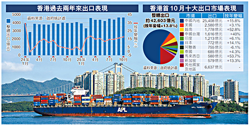 香港外貿持續好景,出口連升20個月。特區政府統計處昨公布,最新10月出口增長17.5%,較9月加快1.4個百分點,亦高於市場預期的升10.7%。本港10月主要出口市場全線增長,其中出口馬來西亞大增139.4%,而受iPhone17付貨帶動,出口美國也大幅改善,由9月的4.8%升幅,顯著擴大至10月的40.5%。特區政府發言人指出,環球經濟維持溫和增長,加上近期外圍貿易政策的不確定性減退和對電子相關產品的需求持續,短期仍有利香港的商品貿易增長。 ●香港文匯報記者 莊程敏據政府統計處公布,本港整體出口貨值繼9月錄得16.1%按年升幅後,10月出口貨值為4,618億元,按年上升17.5%。同時,進口貨值繼9月錄得13.6%的按年升幅後,10月進口貨值為5,017億元,按年上升18.3%。10月錄得有形貿易逆差399億元。以首10個月計,本港出口貨值按年升13.8%,進口貨值升13.6%,錄得有形貿易逆差3,340億元。港上月出口大馬增139%最勁按出口市場計,本港今年10月輸往亞洲的整體出口貨值上升15.6%。其中,出口馬來西亞升139.4%、越南升56.0%、中國台灣升50.2%、印度升31.8%和中國內地升9.8%。除亞洲主要市場外,輸往其他地區的大部分主要目的地的整體出口貨值亦錄得升幅,尤其是荷蘭(升56.8%)和美國(升40.5%)表現突出。以主要貨品類別計,10月「電動機械、儀器和用具及零件」(增303億元,升16.1%)和「通訊、錄音及音響設備和儀器」(增176億元,升35.7%)的出口表現最佳。同期,部分主要貨品類別的進口貨值錄得升幅,尤其是「電動機械、儀器和用具及零件」(增406億元,升21.5%)和「通訊、錄音及音響設備和儀器」(增232億元,升45.5%)。電子產品需求持續帶動出口政府發言人昨日指出,本港10月商品出口貨值進一步大幅增長,反映環球經濟維持溫和增長,加上近期外圍貿易政策的不確定性減退和對電子相關產品的需求持續,相關情況短期內應會繼續有利香港的商品貿易增長。發言人亦提醒,貿易壁壘的持續影響仍值得關注,強調政府將保持警覺,並將致力加強香港與不同市場的經貿聯繫,亦將繼續提供支持。大新金融集團首席經濟及策略師溫嘉煒指出,本港進出口增速均有所加快,10月整體出口按年升幅加快1.4個百分點至17.5%,為今年3月以來最大升幅,升幅並超過市場預期的10.7%及大新預期的15.9%。值得留意的是,輸往中國內地的出口升幅由9月逾16%收窄至不足一成,輸往韓國的出口亦放緩至約1%,不過輸往亞洲其他主要國家的升幅普遍都有所擴大,輸往美國的升幅更由不足5%顯著擴大至約四成,都抵消了對中國內地出口增長放緩的影響。大新料港全年出口增長10%展望本港外貿前景,溫嘉煒認為,中美延長關稅休戰,或會紓緩部分出口商加快出貨的迫切性;但同時出口商開拓美國以外的新市場,亦或將繼續推動相關地區出口增長。該行估計,本港今年全年出口增長或略高於10%,明年增長則可能放緩至5%。事實上,自4月美國向全球貿易夥伴加徵額外關稅後,中美兩國不斷互加關稅至歷史高位(145%),雙方在一個月後於瑞士日內瓦達成「貿戰休兵」協議,為兩國貿易談判設定90天休戰期,原定於8月12日結束。至8月11日,白宮宣布,美國總統特朗普簽署行政命令,將美國對華關稅的暫停期再延長90天,即將於11月到期。市場分析指,這或令不少出口商有「搶先出口」的情況。同時,蘋果公司今年9月發布的iPhone17新系列手機,受到市場高度關注,各地銷售表現強勁,新手機付運也帶動本港10月的出口表現。