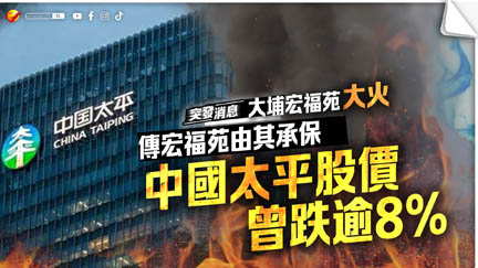 中國太平(966)股價今日(27日)曾跌逾8%,低見16.77元,較早前報17.58元,跌逾3%。據報,宏福苑由中國太平承保,財產全險(Property All Risks)賠款總上限為20億元。