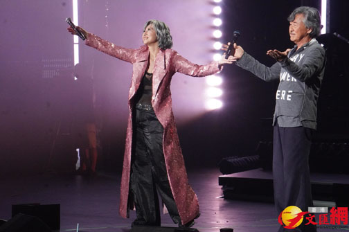 香港文匯報訊(記者 子棠)林子祥(阿Lam)與葉蒨文(沙麗)相隔27年再度合體舉行一連五場《白頭到老 WE ARE ONE 世界巡迴演唱會—香港站》,昨晚於紅館開鑼,吸引了朱玲玲與丈夫羅康瑞、導演賈樟柯、譚輝智、吳浩康夫婦、蔡一智、狄波拉等眾多圈中好友捧場。77歲的阿Lam負傷上陣,全晚仍盡顯神級唱功,且氣不喘、水不喝,狀態驚人,還感性得兩度含淚;64歲的沙麗則活力四射如同「電兔」般躍動舞台。