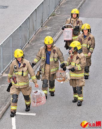 香港文匯報記者不時目睹身穿「黃金戰衣」的消防員來回穿梭火場,他們拖着疲憊身軀通宵奔波,交更期間趁機席地休息片刻,亦有身披保暖錫箔紙的消防員由同袍陪同離開稍作休息,更有全身「戰衣」熏黑離開火場的消防員救出居民的寵物雀鳥後,脫下頭盔即時露出高溫奮戰後焗得紅彤彤的臉龐。
