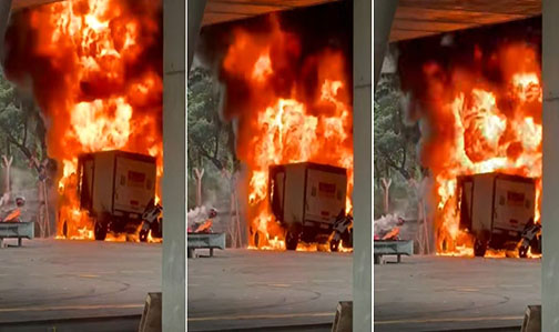 香港文匯報訊(記者 蕭景源)今日(17日)下午2時許,葵涌貨櫃碼頭南路近3號迴旋處一個露天停車場內有貨車冒煙起火,火勢迅速蔓延,全車陷入一片火海及傳出爆炸聲,濃煙直沖逾百米半空,遠近皆見。消防員接報趕至開喉灌救將火救熄,車尾附近兩輛棄置電單車亦被波,幸未有造成傷亡。消防員經調查發現貨車內有易燃液體,初步起火原因有可疑,相信火警涉及非法流動加油站,轉交警方跟進。今日傍晚6時,警方聯同消防處召開記者會講述案件詳情。消防處助理消防區長(危險品執法)黃文健表示,消防處於今日下午2時09分接獲報案,指葵涌貨櫃碼頭南路的停車場發生火警,消防人員於3分鐘內抵達現場,火警於下午2時16分被救熄;火警中,消防處共調派一輛消防車、一輛救護車,出動6名消防人員及3名救護員,動用一喉及一隊煙帽隊進行灌救工作。火警涉及一輛輕型貨車和兩輛電單車,消防員在現場發現懷疑易燃液體燃燒痕跡,並在嚴重焚毀輕型貨車上檢獲油缸、油喉及油槍等加油工具。