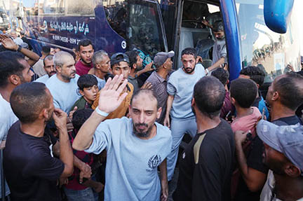 以色列當局周一(10月13日)依照停火協議,釋放近2,000名被捕巴勒斯坦人,其中有巴人已被囚長達24年,終於重見天日。在約旦河西岸城鎮拉馬拉,數以百計巴人居民翹首以盼,看到闊別多年的親人終於回鄉,人群中響徹歡呼聲,許多人忍不住與親友相擁而泣,形容在漫長衝突後能與家人團聚猶如奇跡。許多獲釋囚犯身體虛弱,需親友攙扶行走。被問及獄中待遇,一名匿名囚犯坦言情況極其惡劣,他害怕遭到以色列當局報復,不敢詳細說明。另一匿名囚犯坦言,過去兩年是他「人生中最黑暗的歲月」,監獄內的條件非常艱苦,他們被剝奪醫療照顧權利,也沒有充足的食物,甚至遭到毆打和虐待。