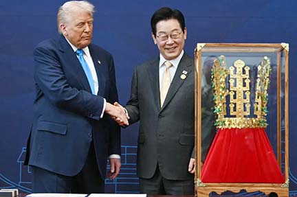 韓國是特朗普是次亞洲行程最後一站,總統李在明政府特地為特朗普準備大量名貴禮物,包括韓國最高等級國家勳章「木槿花大勳章」,以及新羅金冠冢王冠複製品。《華盛頓郵報》報道,韓方宣稱勳章旨在表彰特朗普在朝鮮半島扮演的「和平締造者」角色,設法緩解兩國的貿易和國防緊張局勢。