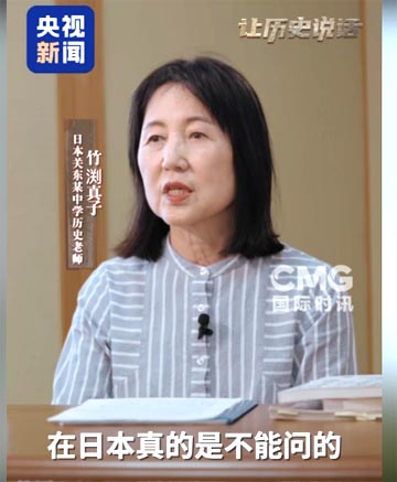 日本中學歷史老師竹渕真子在接受記者採訪時表示,日本的學校以所謂「歷史觀點未定論」為由,讓老師們盡量不教二戰以後的歷史,「在戰場上究竟發生了什麼,在日本真的是不能問的,大家都保持沉默」。日本的初中歷史教科書裏,日軍暴行的照片一張都沒有。還有家長曾對她說,「別再講戰爭之類的事了」。竹渕真子說,她希望孩子們能夠看到當年的真實畫面,了解歷史真相。她還表示,如果跟學校的領導層說接受了我們的採訪,甚至可能會被要求馬上辭職。