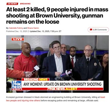 美國警方13日表示,位於羅得島州普羅維登斯市的布朗大學當天下午發生槍擊事件,多人中彈。據《紐約郵報》報道,事件造成至少兩人死亡、九人受傷,槍手隨後逃脫警方追捕,目前仍然在逃。