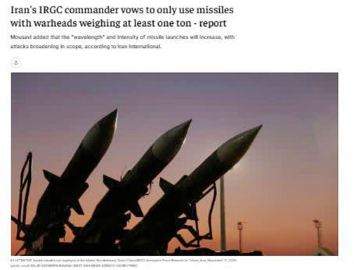據報道,穆薩維補充說,伊朗導彈發射的節奏和強度將會增加,打擊範圍也將擴大。另據《耶路撒冷郵報》援引《華爾街日報》專家分析稱,「儘管伊朗的武裝力量因美國和以色列的打擊而遭到一定削弱,但它仍有強大的武器庫可以動用。」分析認為,這些武器包括巡航導彈、網絡戰武器以及水雷。專家還稱,憑藉現有的儲備,伊朗「可能具備在更大範圍上升級衝突的能力」。